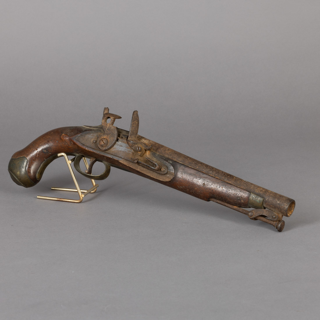 De fabrico português do modelo Land Patterrn, inicio do Séc. XIX. Muito bom fabrico. Cão com falta de peças e mola da caçoleta partida. Tem no interior os encaixes do mecanismo (impecável) extraordinariamente bem moldados. Falhas na madeira junto à caçoleta e vestígio de xilófagos. Vareta de Cavalaria Ausência de marcas ou punções. Depois de restaurada irá ficar uma notável peça de colecção.