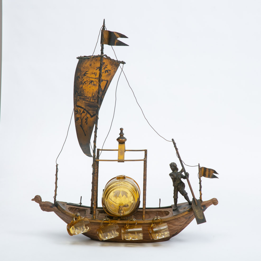 Em madeira, metal amarelo e outros materiais, pipo (com cabelo) e quatro copos em vidro colorido. Sinais de uso, faltas e pequenos defeitos.