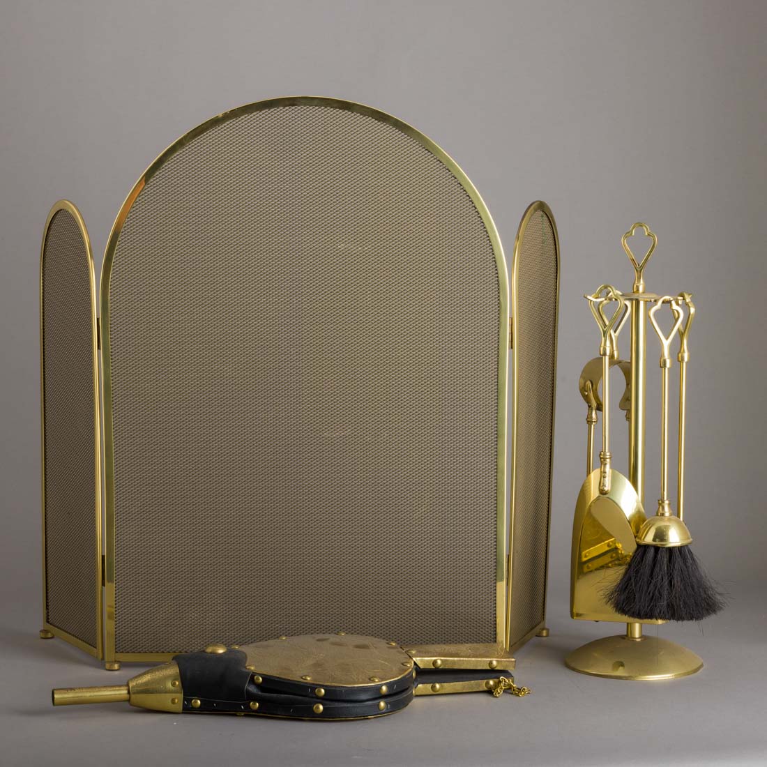 Em metal amarelo e outros materiais. Composto por frente de lareira, utensílios e fole. Sinais de uso e pequenos defeitos.
