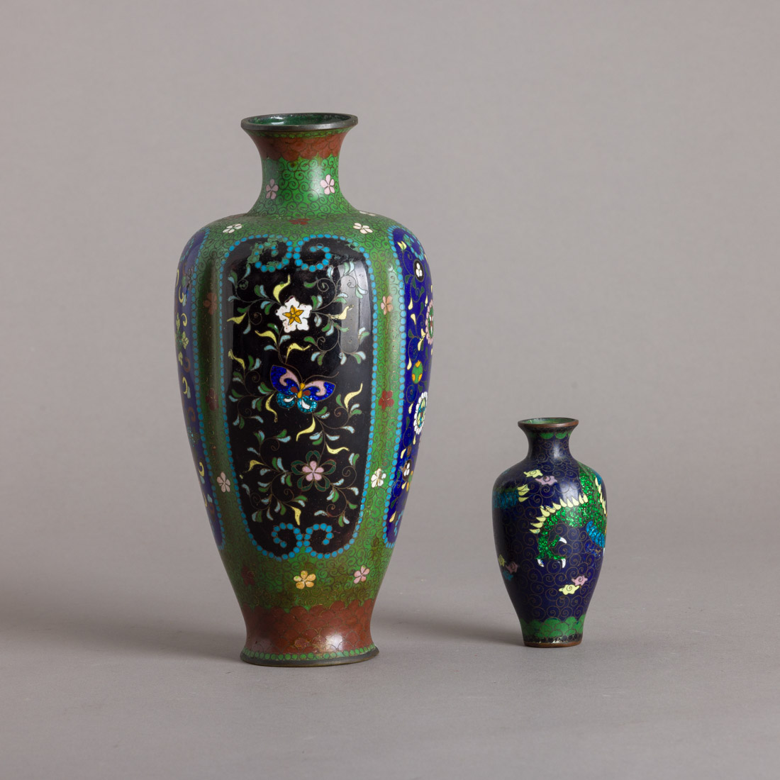 Em metal cloisonné, decoração policromada "flores" e "dragão". Japão. Séc. XIX/XX. Pequenas falhas e algumas amolgadelas.