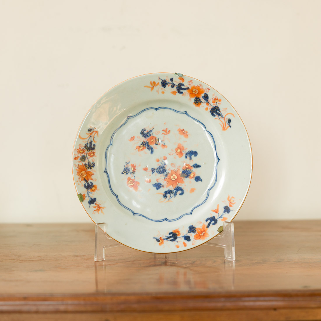 Em porcelana da China Companhia das Índias, Séc. XVIII, decoração "Imari", decoração a azul, rouge de fer e dourado "flores". Desgaste.