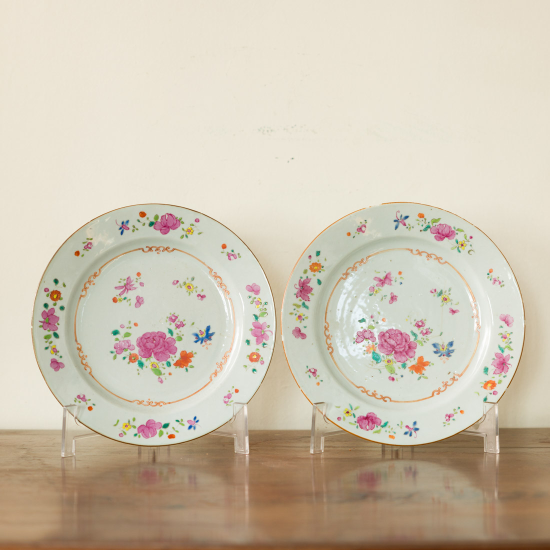 Em porcelana da China Companhia das Índias, Séc. XVIII, decoração policromada e dourada com esmaltes da família rosa "flores". Esbeiçadelas e um com cabelos.