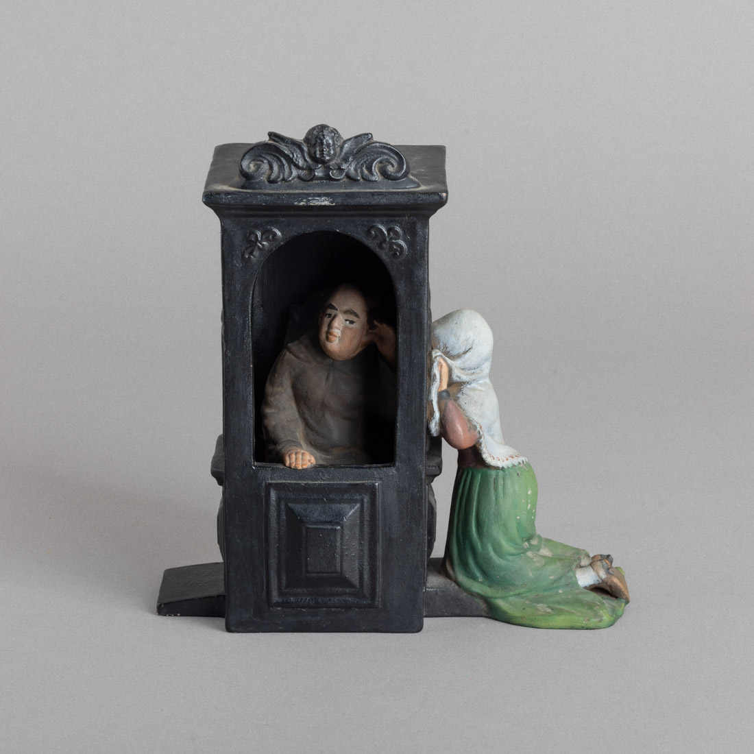 Escultura em cerâmica possivelmente das Caldas, decoração policromada. Falha na mão e pequenos restauros.