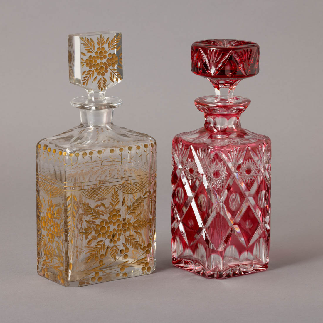 Em cristal, uma bicolor decoração moldada e lapidada, outra gravada com dourados. Ínfimas esbeiçadelas, a dourada com esbeiçadelas na rolha.