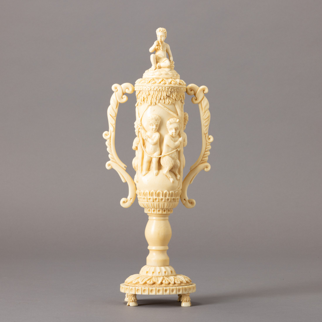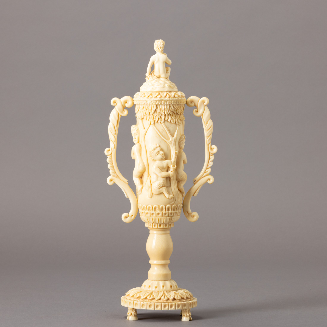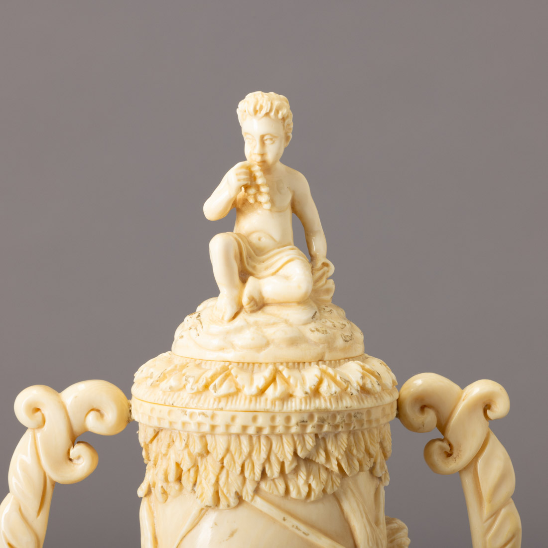 Em marfim esculpido com faunos, meninos e elementos vegetalistas, pomo da tampa "menino" e pés "pata de cavalo". Sinais de uso.