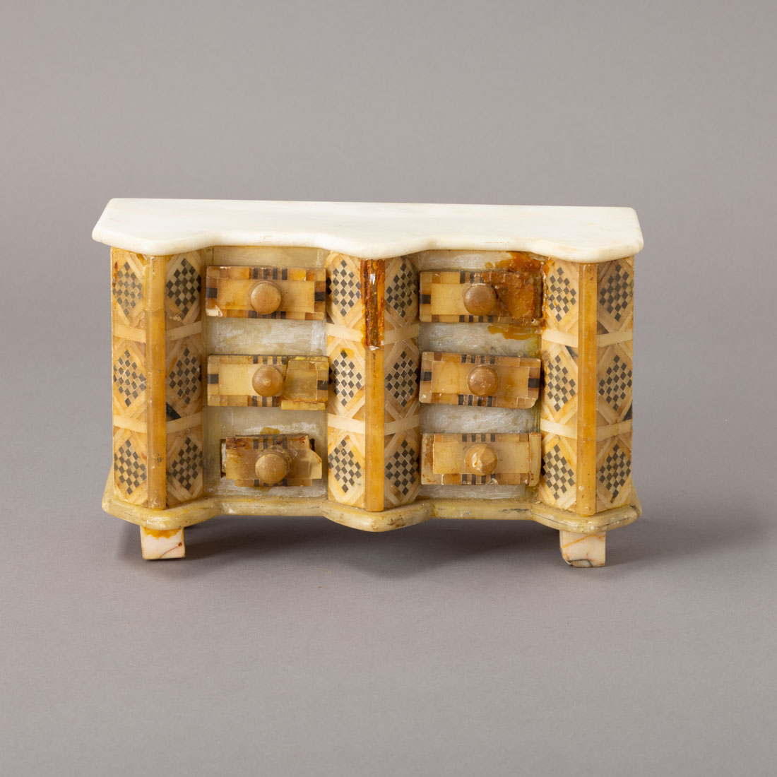 Em alabastro, tampo em mármore, decoração com formas geométricas. Falhas e defeitos.