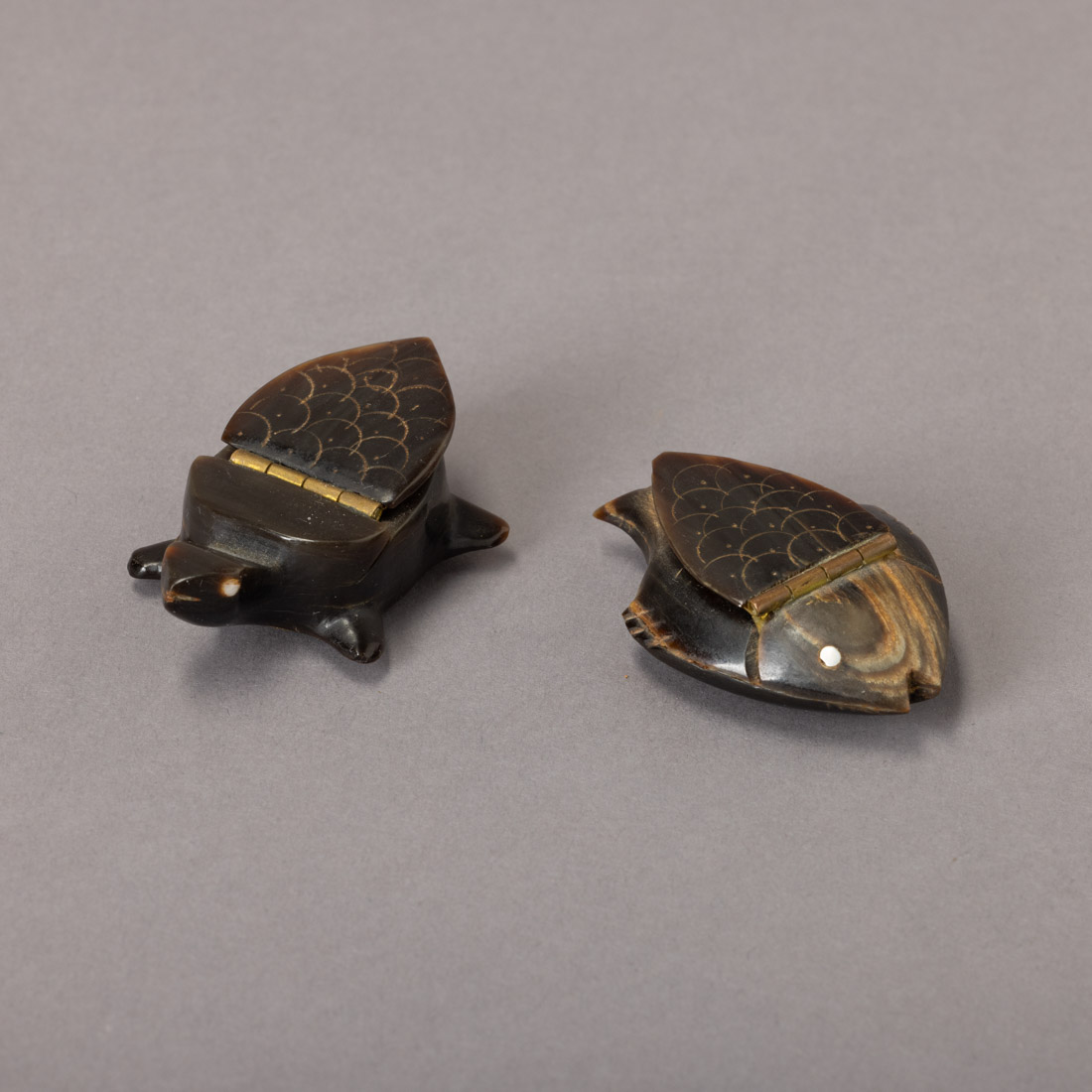 Esculpidas em matéria córnea, na forma de peixe e de tartaruga. Sinais de uso.