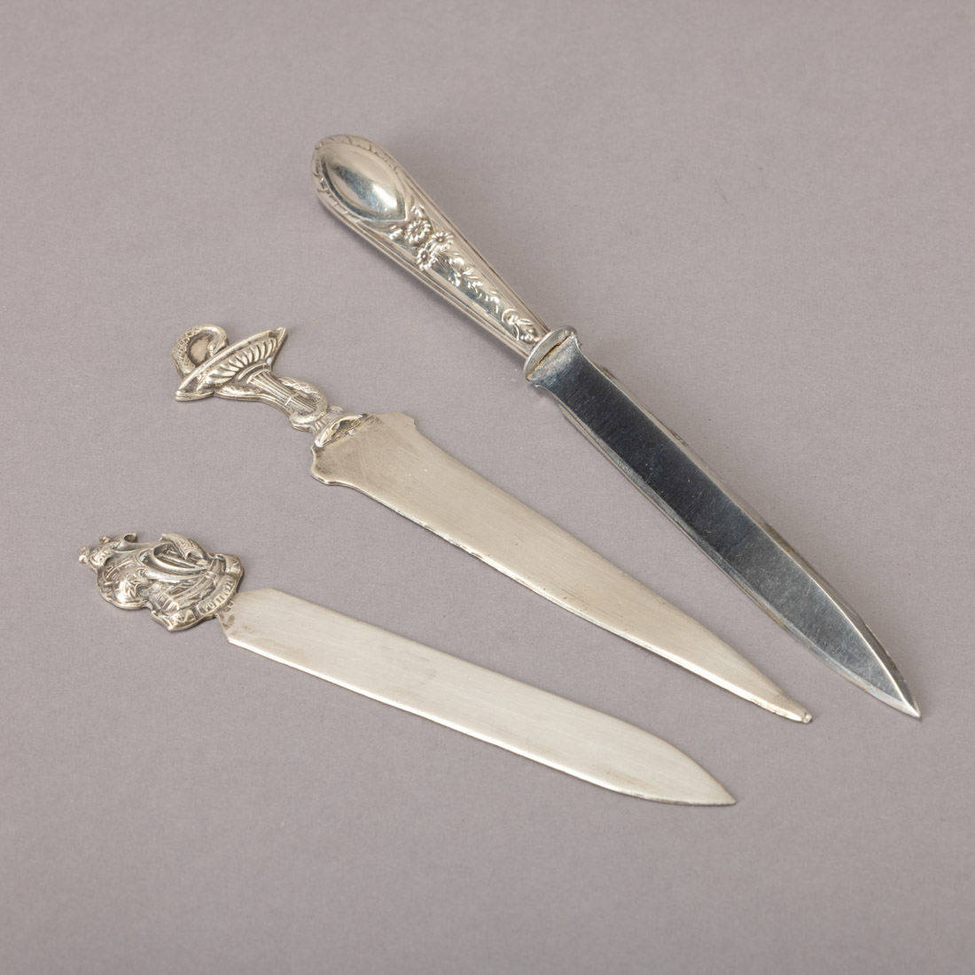 Em prata portuguesa contraste águia (1938-1984) de 833, uma com cabo em prata águia (pós 1985), decoração relevada. Sinais de uso, leves amolgadelas