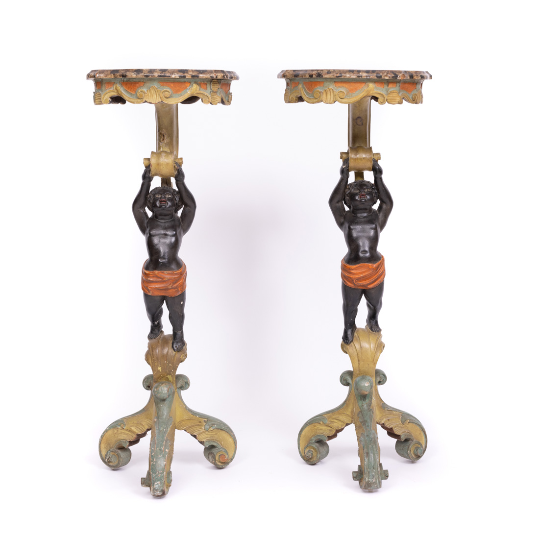 Em madeira entalhada e pintada, decoração policromada, fustes "meninos", pés com enrolamentos vegetalistas, tampos recortados simulando mármore. Pequenas falhas e restauros.