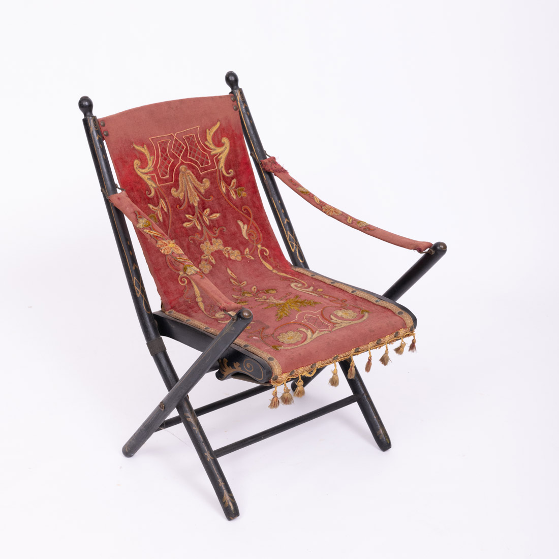 Em madeira pintada a negro realces dourados, assento, costas e apoio de braços estofados a tecido bordado. Séc. XIX/XX. Defeitos e pequenas falhas.