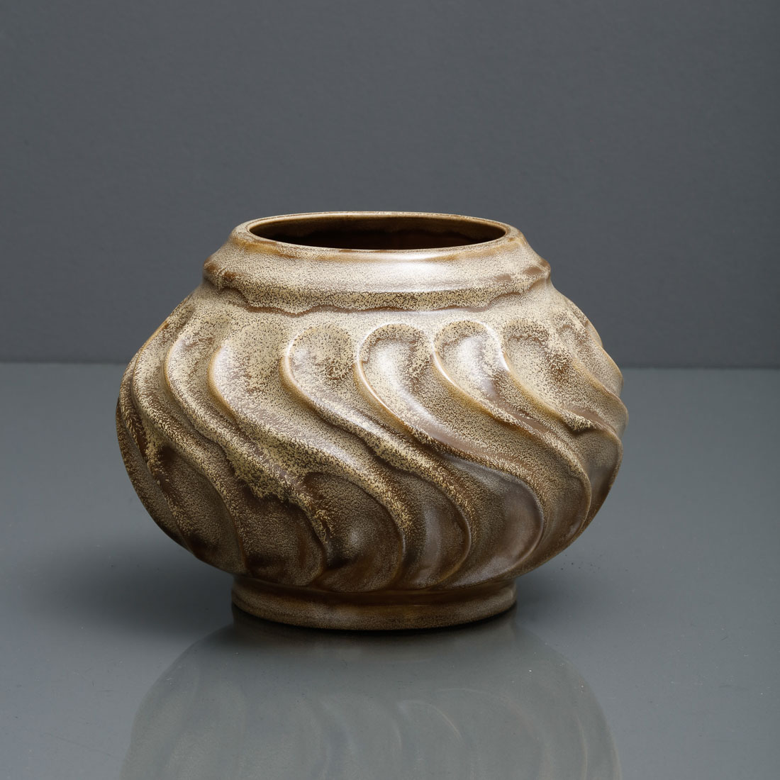 Em cerâmica portuguesa fabrico de Aleluia, Aveiro, decoração relevada e espiralada em tons de castanho. Sinais de uso, pequeno cabelo.