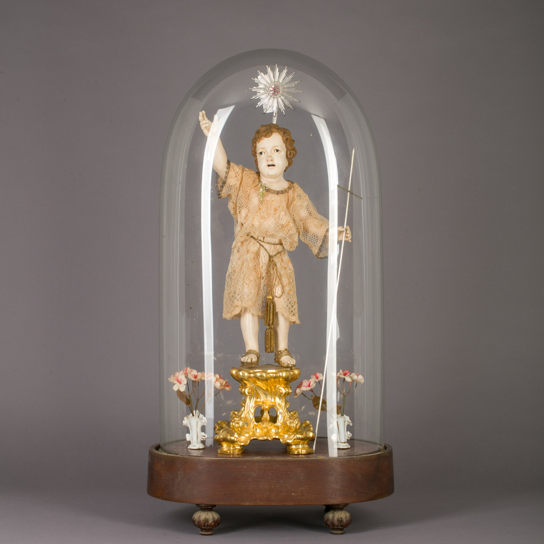 Escultura em madeira policromada, olhos de vidro, atributos em prata, vestes em renda com galões e cordões dourados. Peanha em madeira entalhada e dourada. Redoma em vidro com base em madeira. Séc. XIX. Sem marcas, ao abrigo do D/L n.º 120/2017. Dim.Menino: 38 cm. Peanha: 13 cm. Redoma: 63 cm