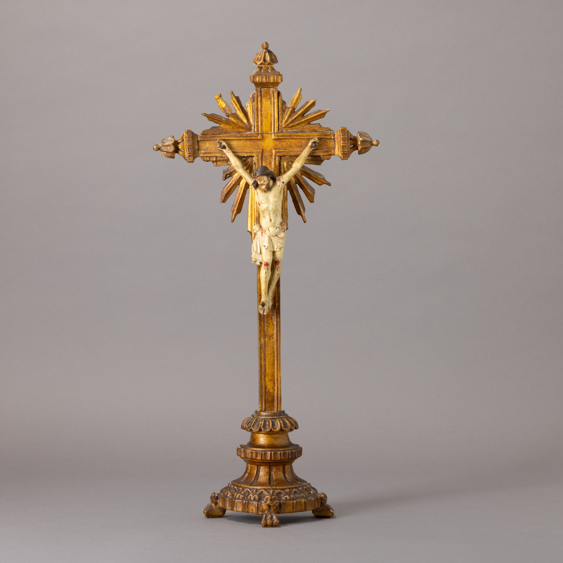 Escultura em madeira policromada, cruz em madeira entalhada e dourada. Falhas, pequenos defeitos e restauros.