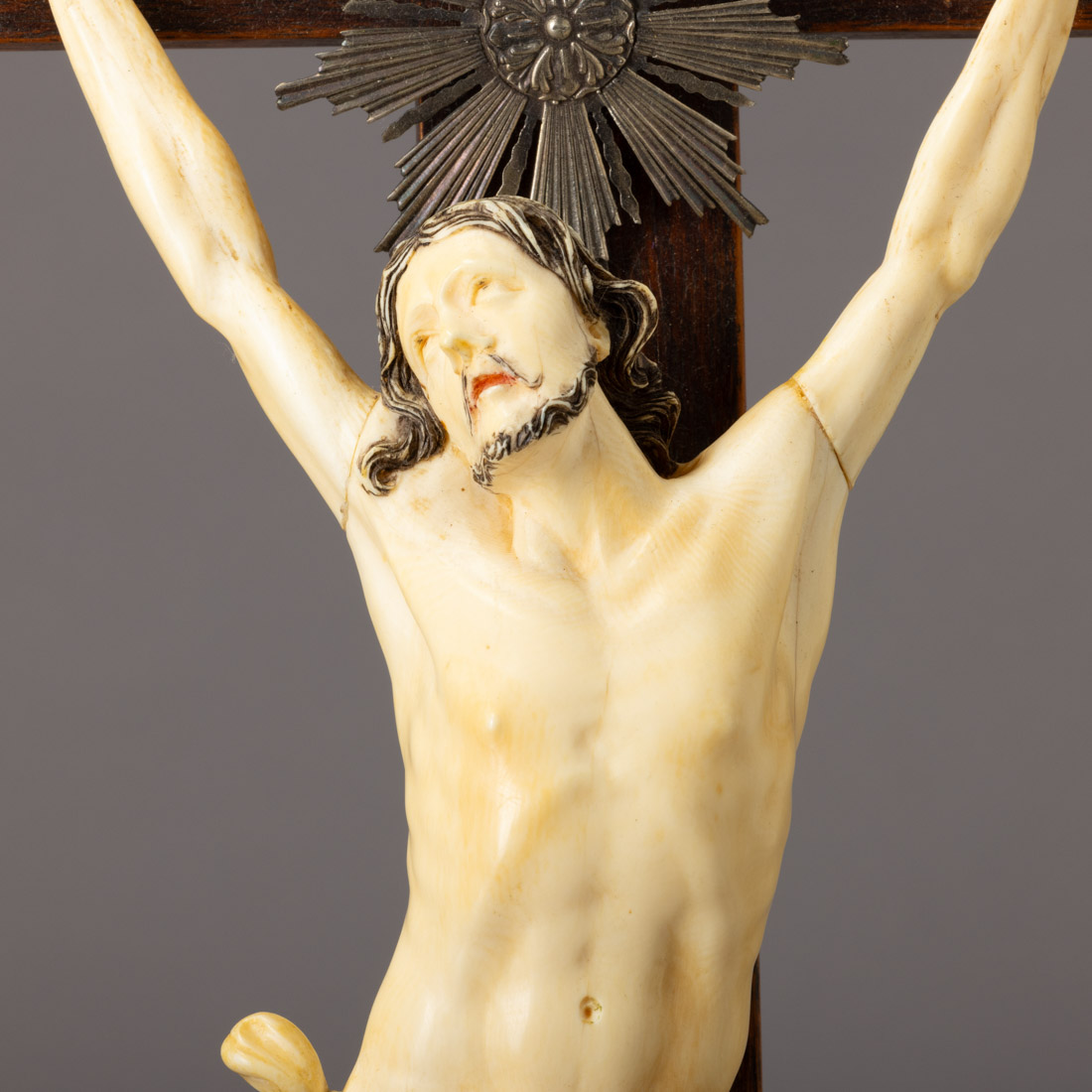 Escultura em marfim parcialmente policromado, resplendor e pregos em prata. Cruz em madeira, terminais e aplicação em marfim. Europa, Séc. XIX/XX. Sem marcas, ao abrigo do Decreto-Lei n.º 120/2017. Sinais de uso.