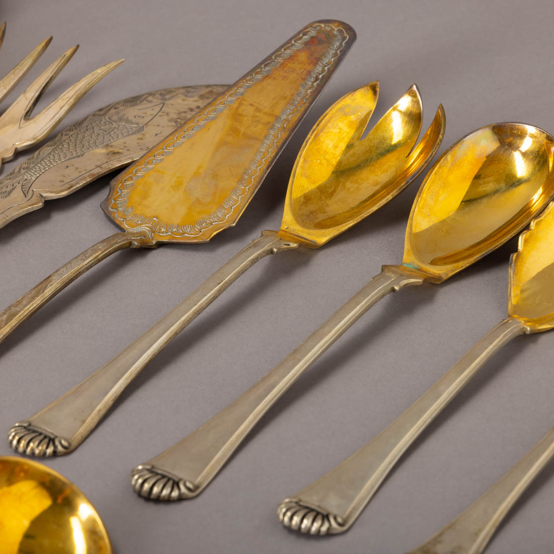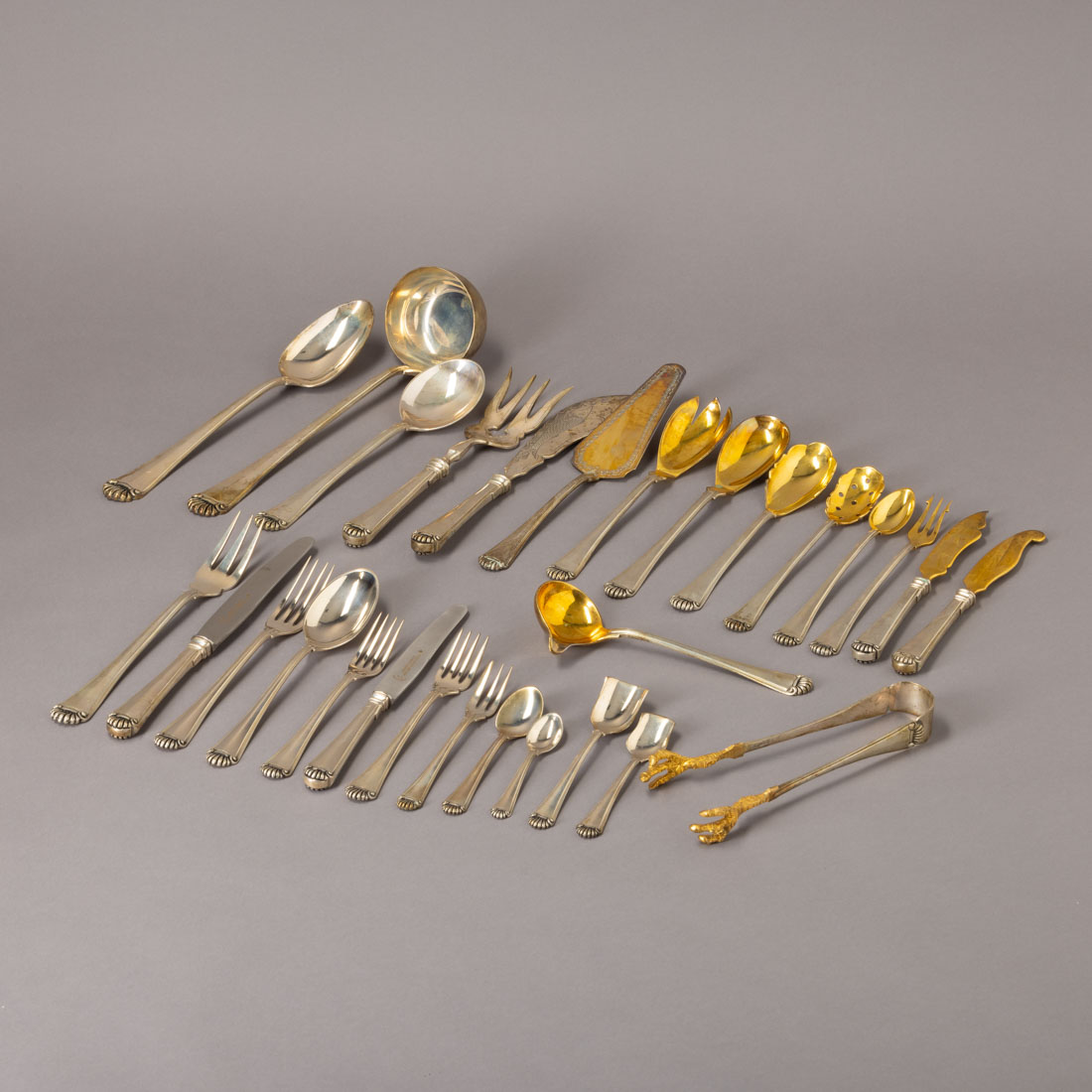 Em prata portuguesa contraste águia (1887-1937) de 833. Composto por talheres de carne, peixe e sobremesa, colheres de sopa, sobremesa, gelado, chá e café, garfos de bolo, 2 conchas de açúcar e 17 talheres de servir. Sinais de uso. Peso total aprox: 8420g. Sinais de uso. Peso total Aprox: 8420g.