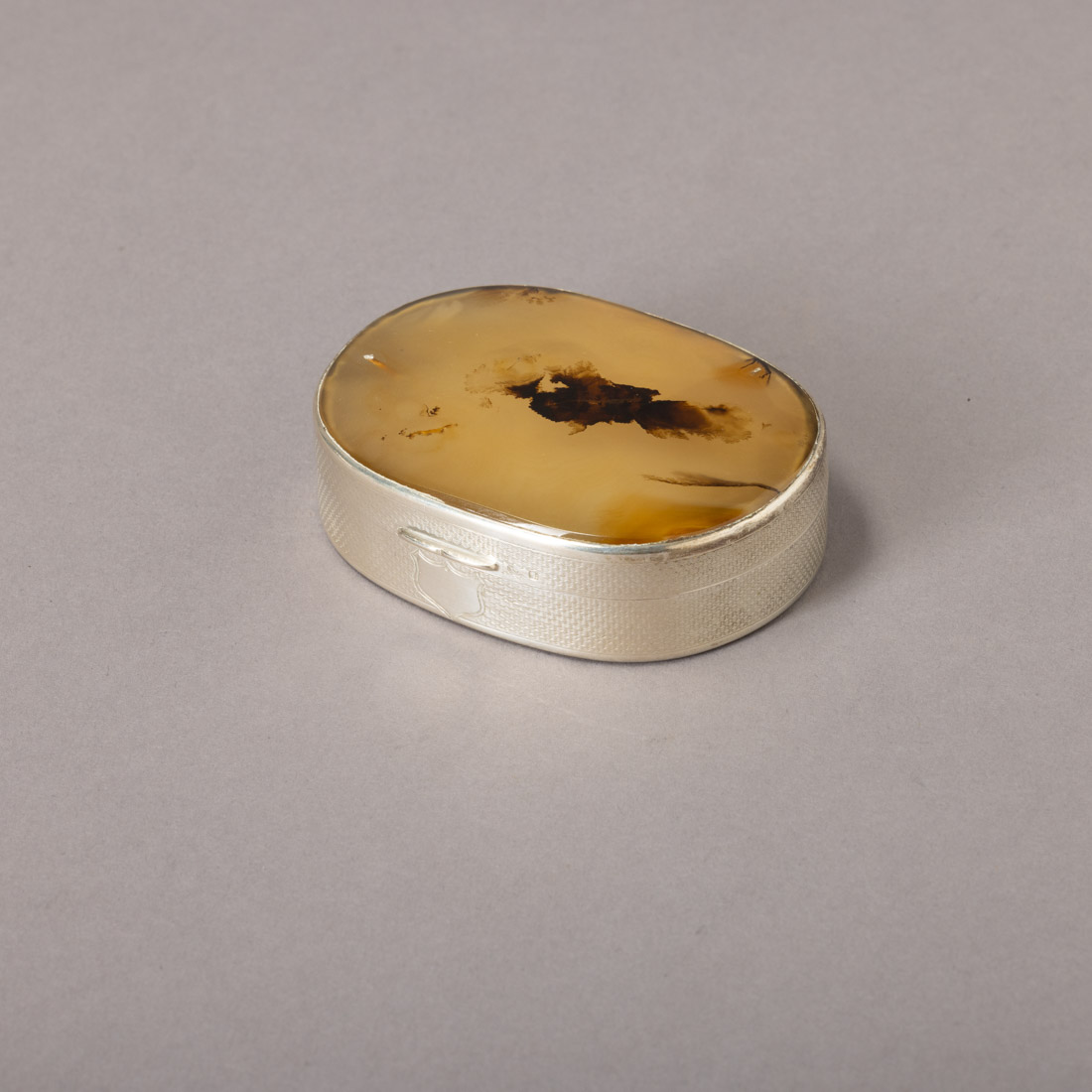 Em prata portuguesa contraste javali (1887-1937) de 833, decoração guilhochada, tampa com placa oval em ágata. Sinais de uso.