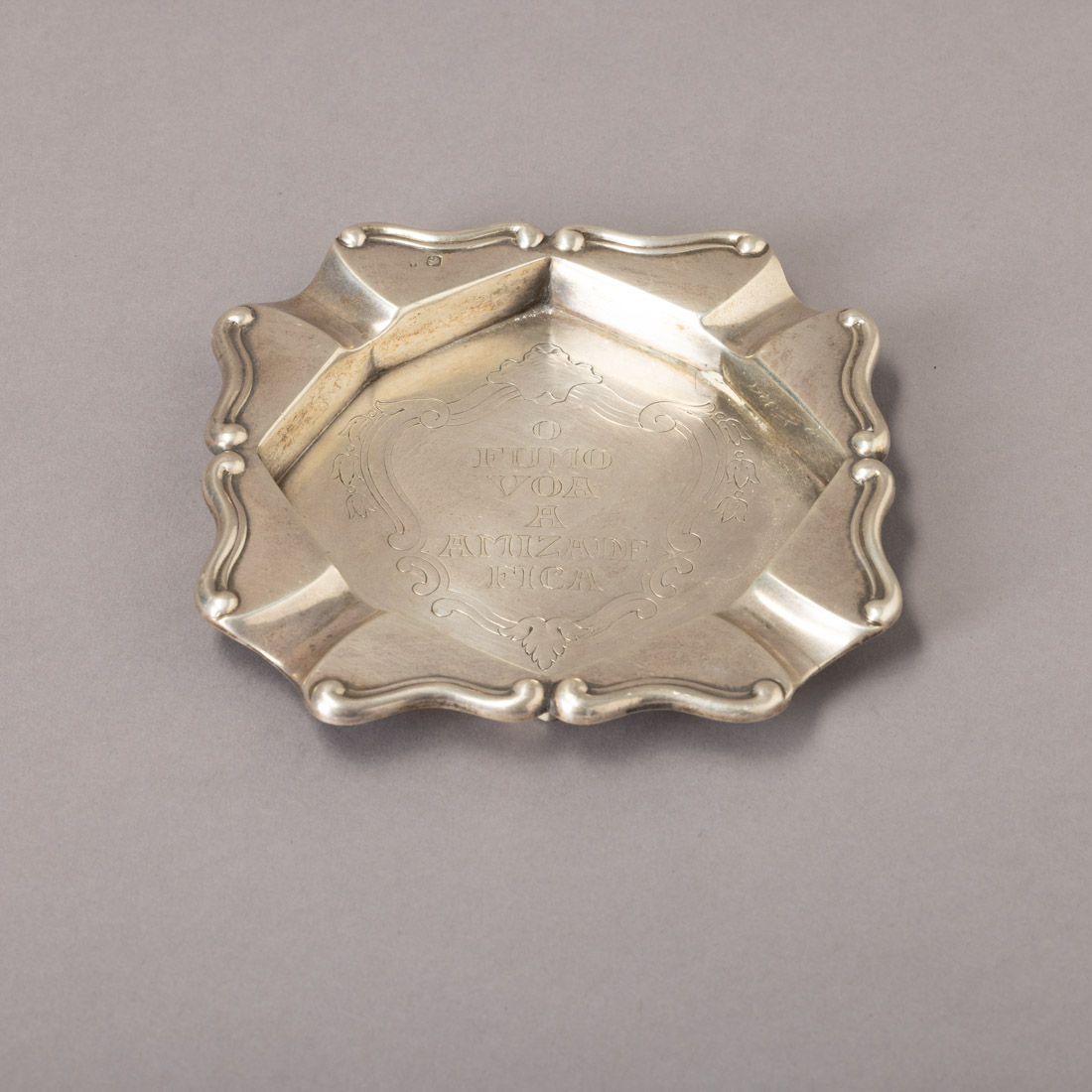 Em prata portuguesa contraste javali (1887-1937) de 833, decoração gravada, marcada J. Rosas, Porto, com inscrição "O Fumo Voa a Amizade Fica". Sinais de uso.