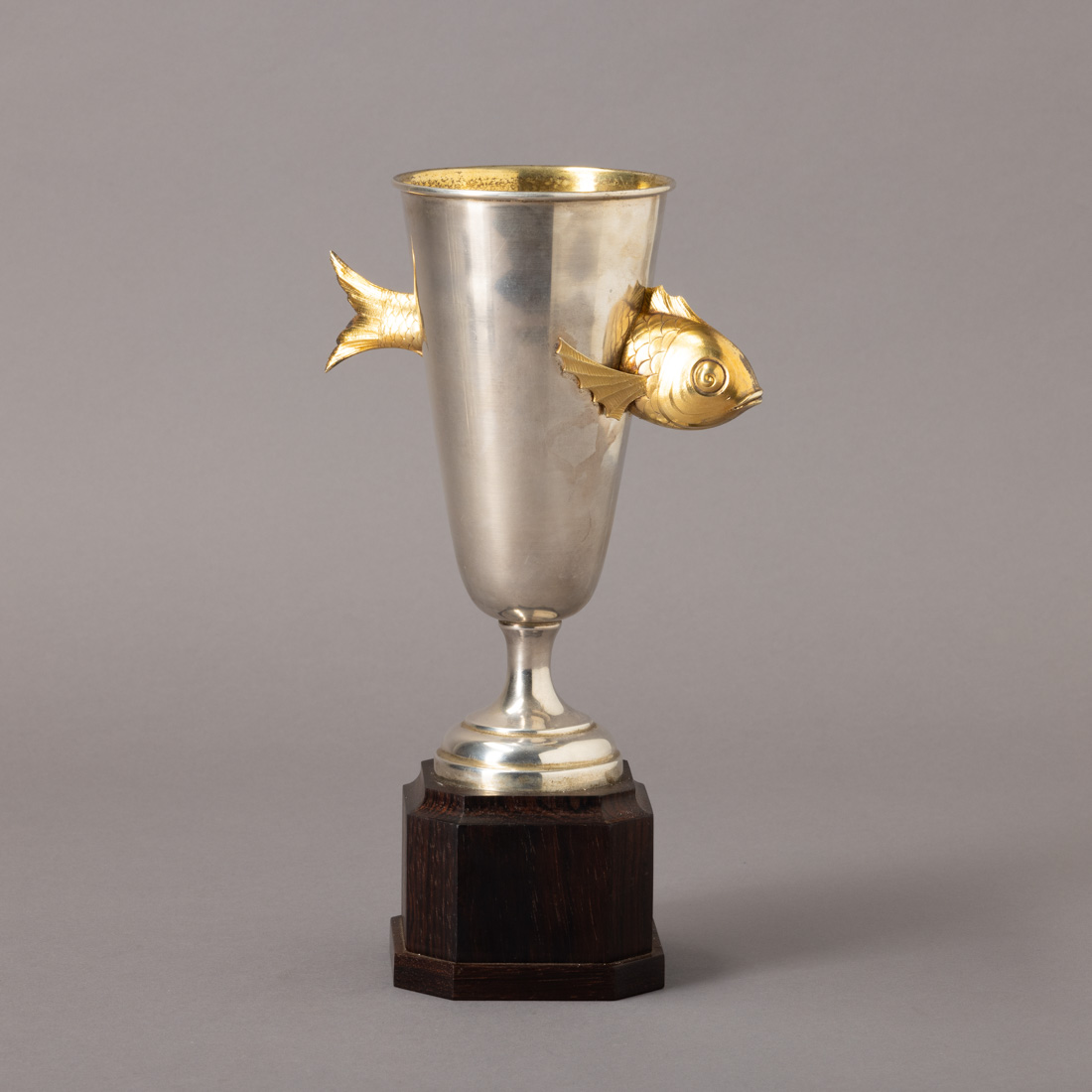Em prata portuguesa contraste águia (1938-1984) de 916, marca de ourives de Lisboa Augusto Luís de Sousa Lda., pegas douradas e relevadas "Peixe". Base em madeira exótica. Sinais de uso.