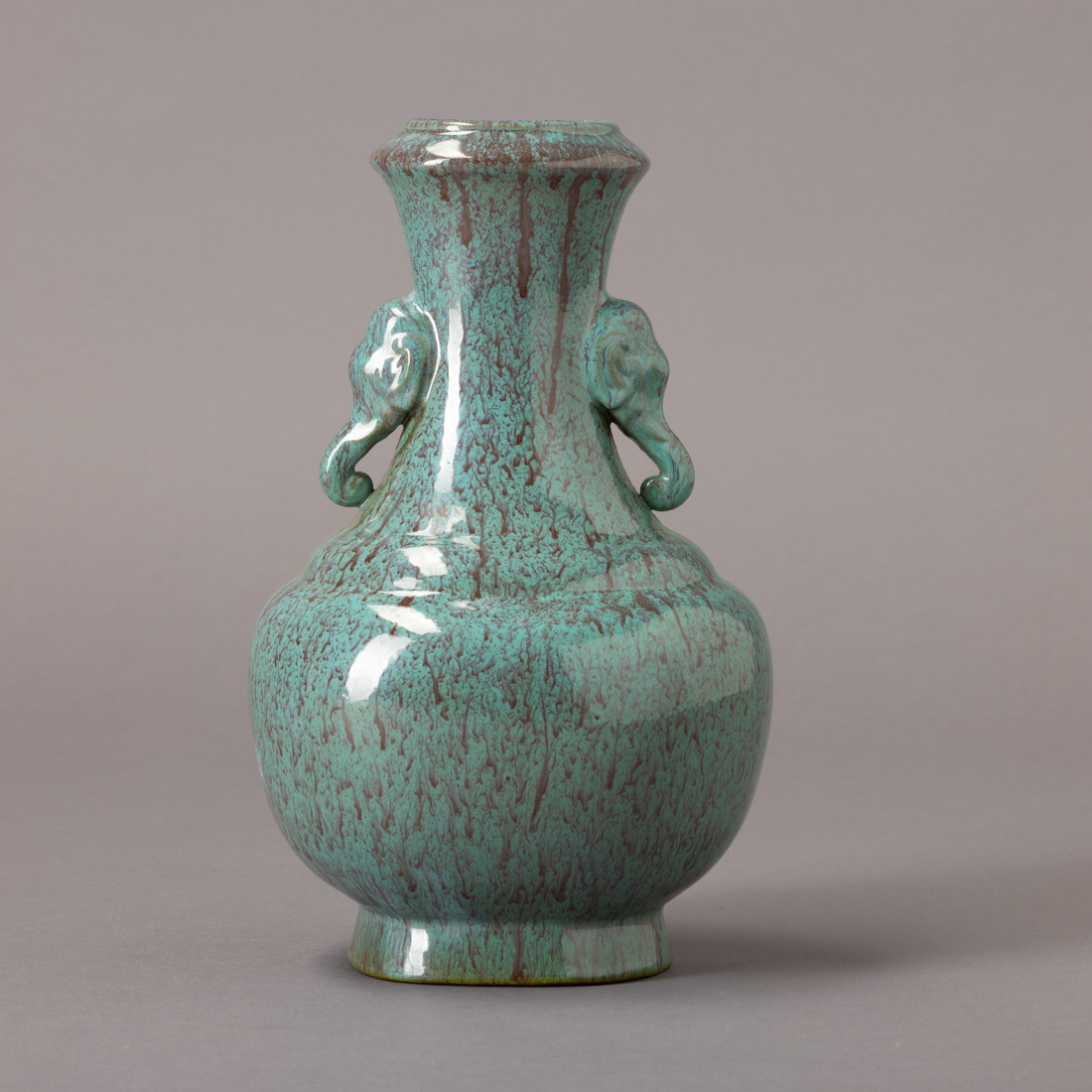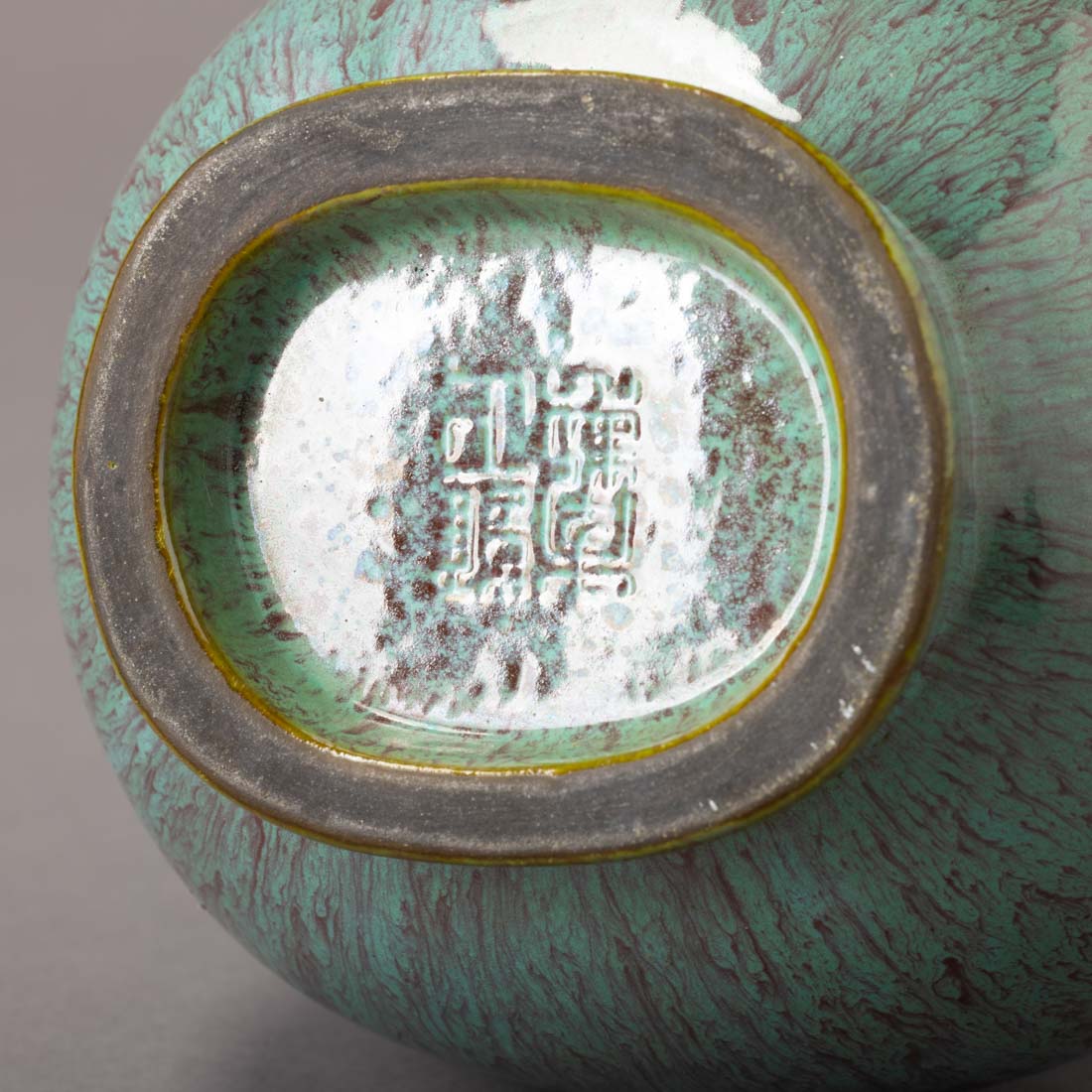 Em cerâmica chinesa vidrada, decoração policromada com escorridos, pegas relevadas "cabeças de elefante". Marcada. Sinais de uso e leve desgaste.
