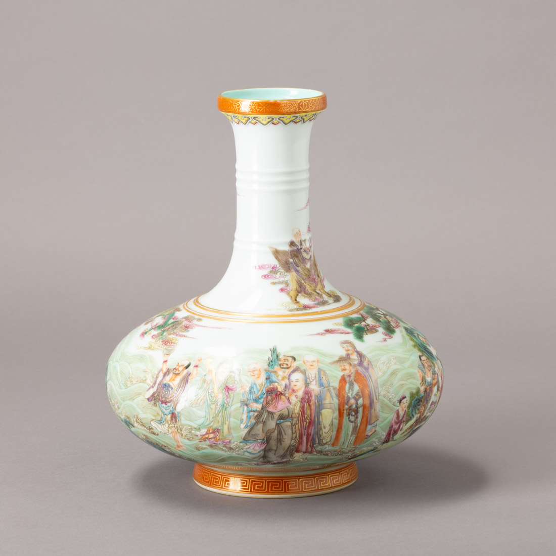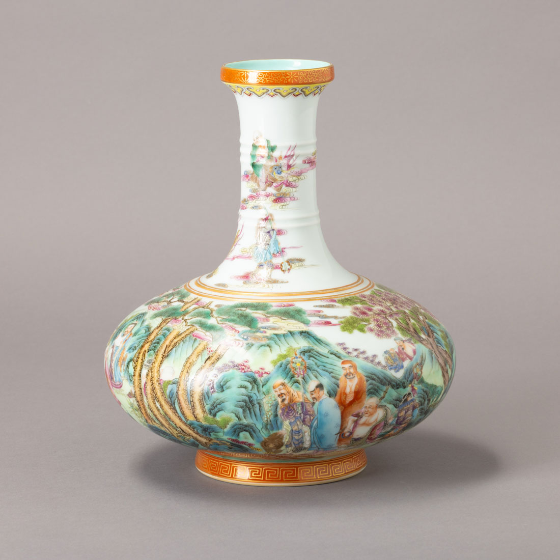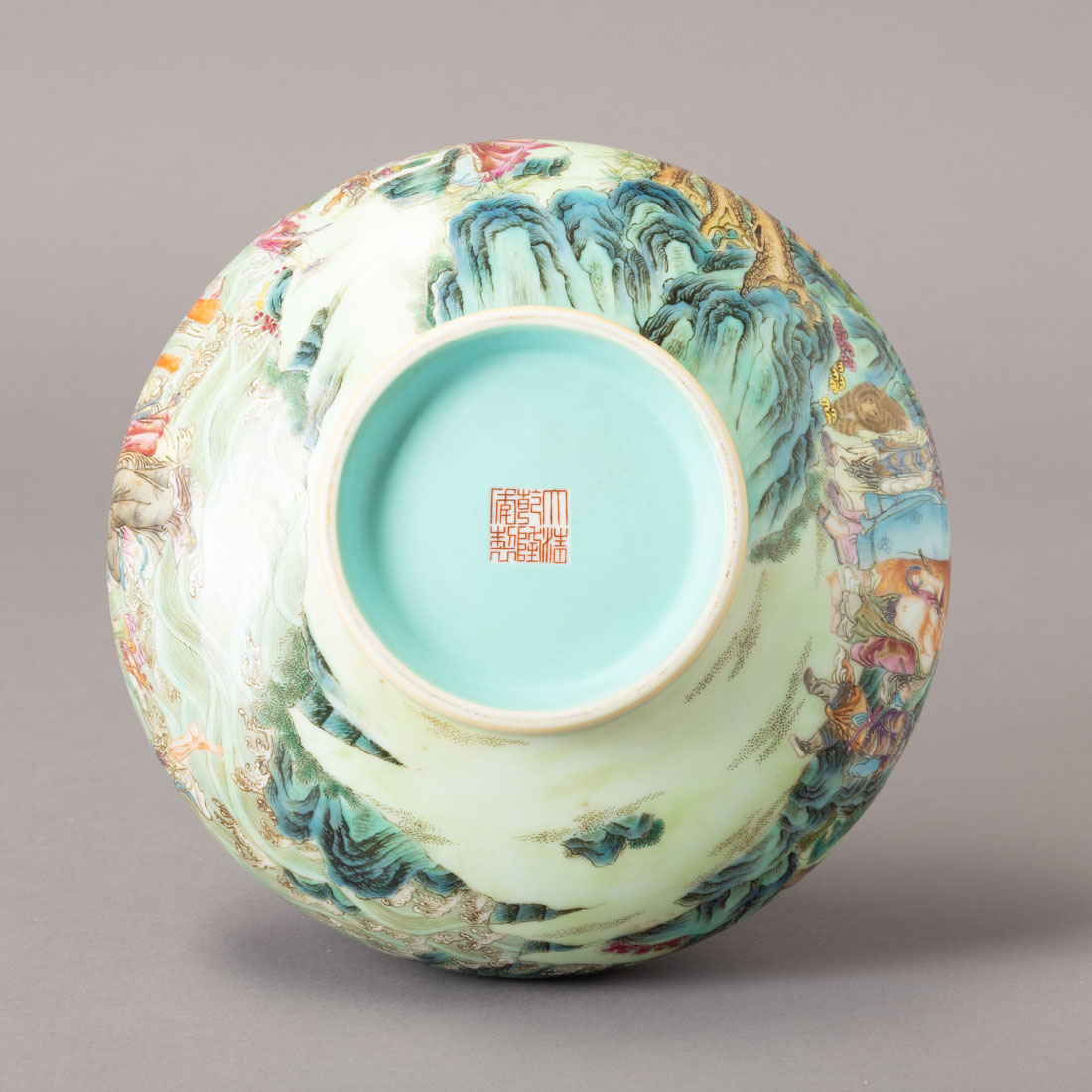 Em porcelana da China, decoração policromada e dourada "paisagem com figuras e animais". Marcada. Sinais de uso.