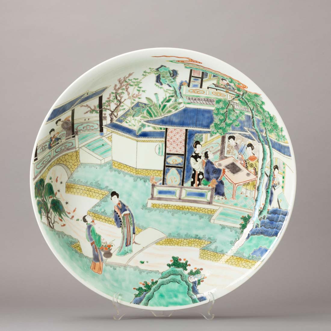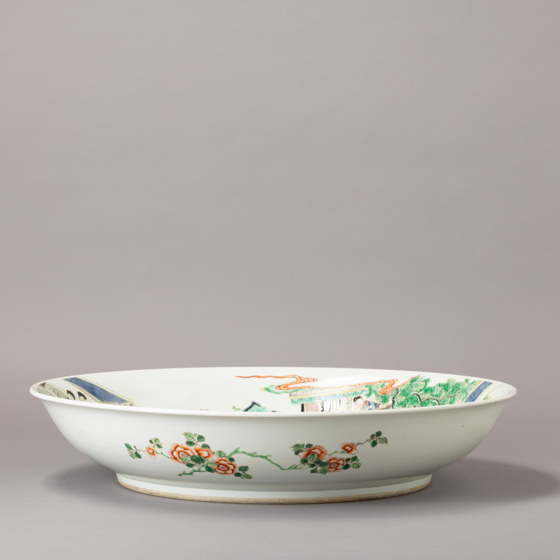 Em porcelana da China, decoração com esmaltes policromos da família verde "paisagem com pagodes e figuras", no verso motivos florais. Sinais de uso.