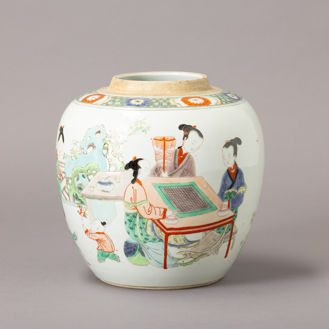 Em porcelana da China, decoração com esmaltes policromos da família verde "cenas do quotidiano". Sinais de uso, ínfimos defeitos de fabrico.