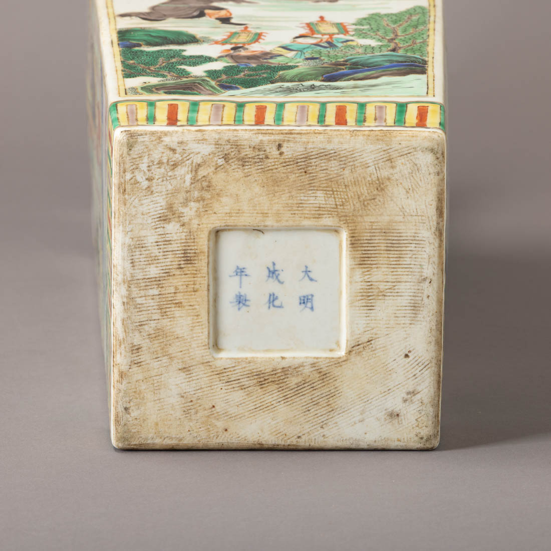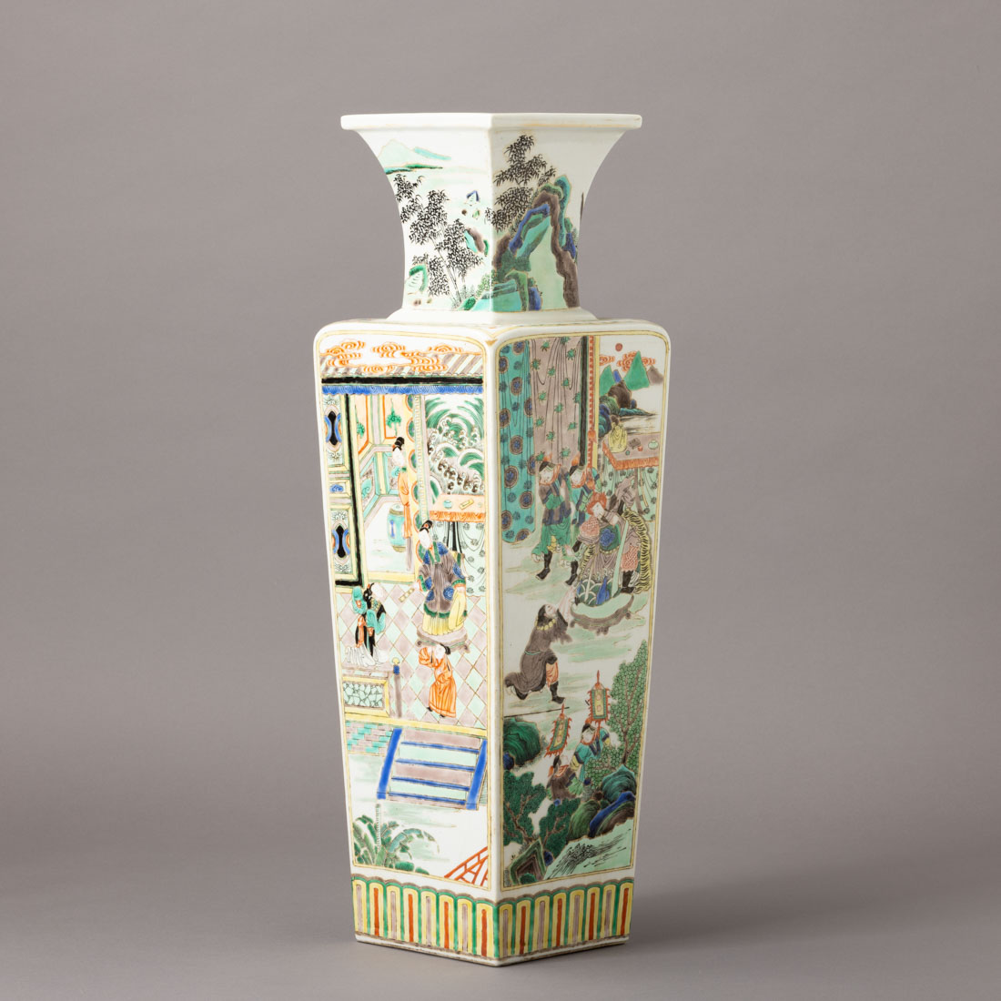 Em porcelana da China, decoração com esmaltes policromos da família verde "paisagens com figuras da corte" e objectos. Marcada. Sinais de uso.