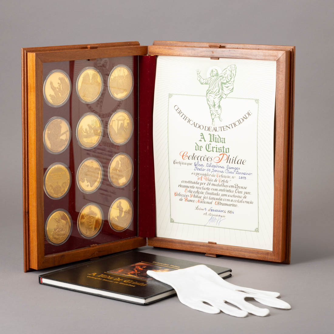 Vinte e quatro medalhas de bronze cinzelado banhado a ouro de 24k. Caixa em mogno e filetes em pau-cetim, acompanhadas por livro explicativo de cada medalha. Colecção e edição limitada pela Philae em conjunto com o Banco Nacional Ultramarino, datado de 1985, livro com nº 1877/4000. Com certificado. Dim.: (caixa) 5x34x24 cm; (medalha) 5 cm; Peso (cada medalha): 50 g.