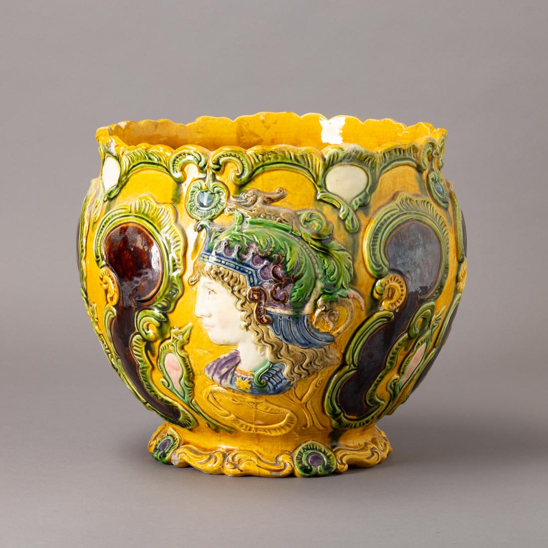Em cerâmica vidrada, decoração policromada com busto e elementos vegetalistas em relevo. Europa, Séc. XX. Esbeiçadelas, cabelos e pequena colagem no bordo (5 cm.)