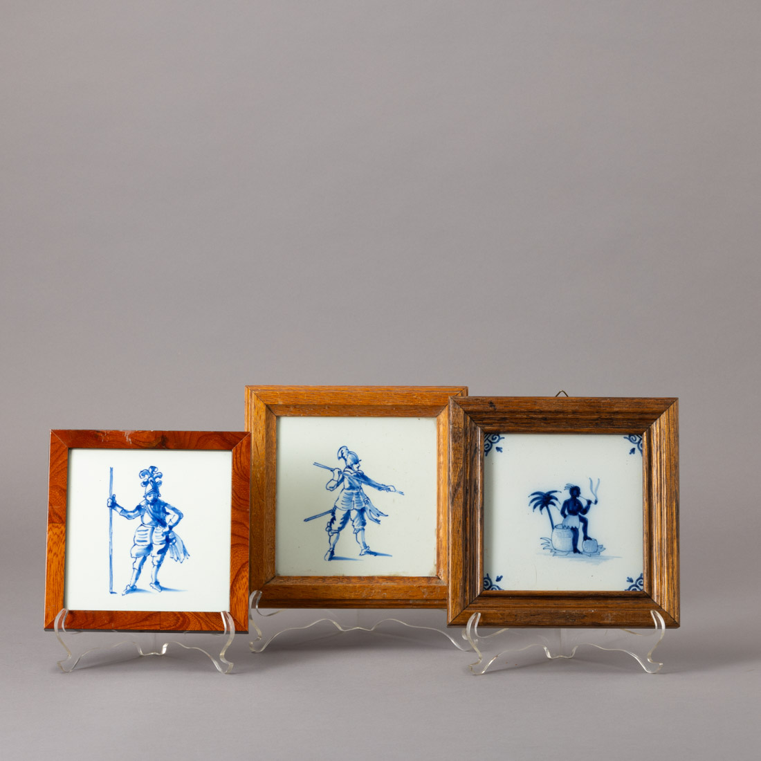 Em cerâmica de Delft, decoração a azul. Holandeses, Séc. XX. Emoldurados. Sinais de uso.