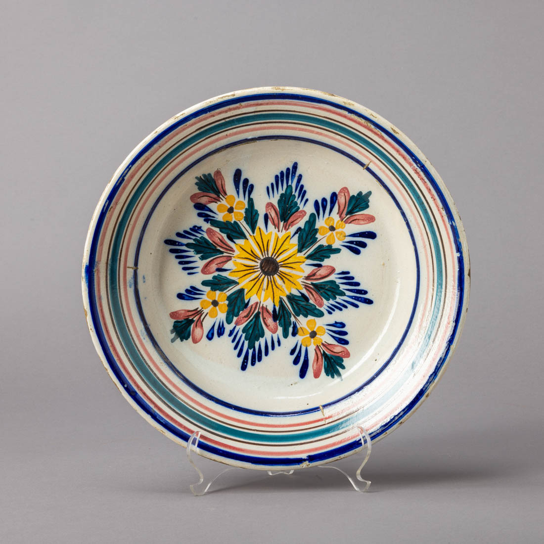 Em faiança portuguesa, decoração policromada "flores". Séc. XIX/XX. Desgaste no vidrado.