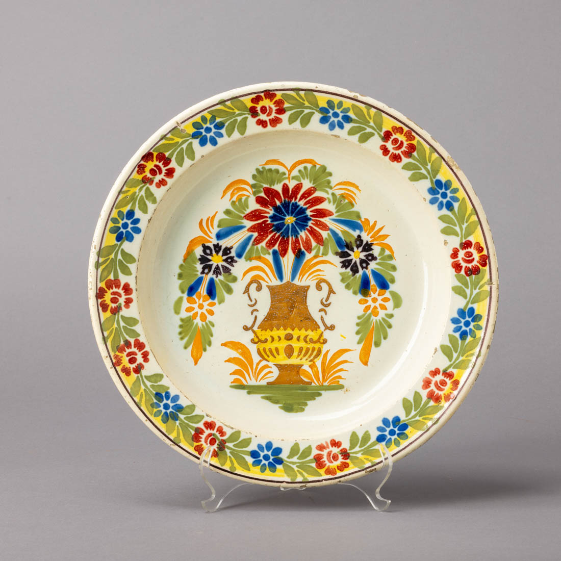 Em faiança portuguesa, decoração policromada "vaso com flores". Séc. XIX/XX. Pequeno cabelo e desgaste no vidrado.