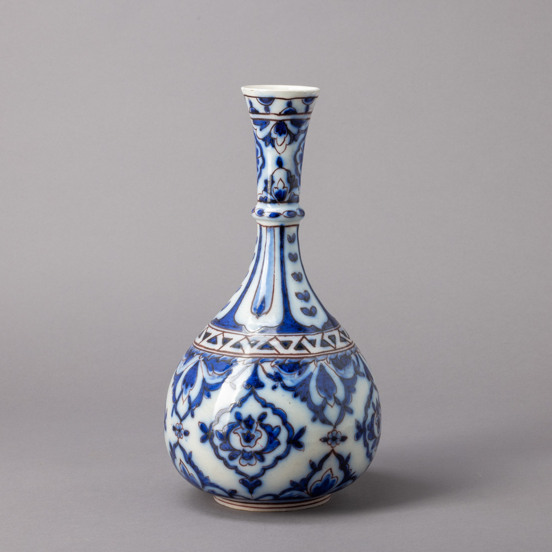 Em faiança portuguesa da Fábrica Constância, decoração azul e vinoso com elementos vegetalistas. Assinada. Sinais de uso.