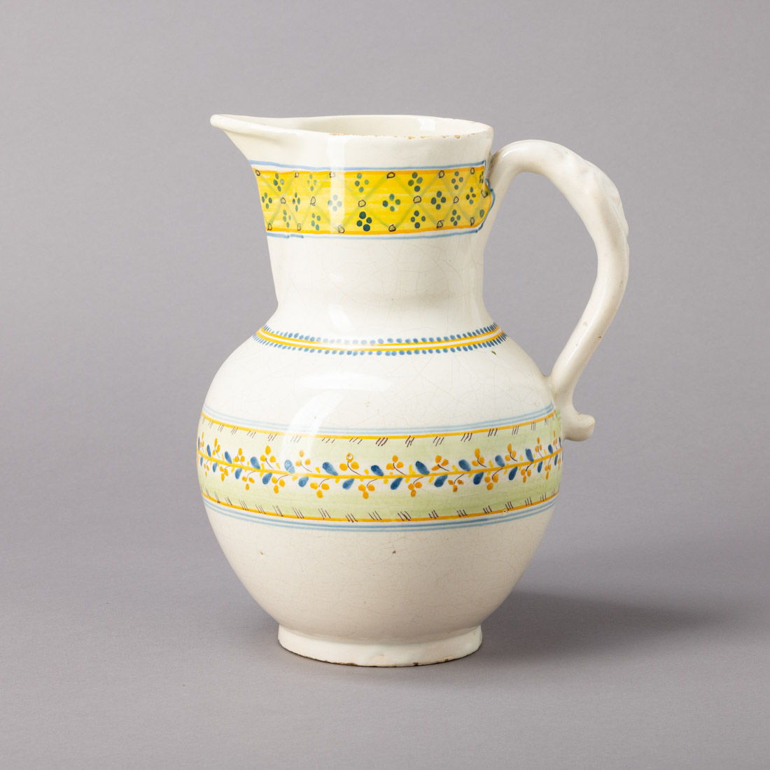 Em faiança portuguesa de Viana, Séc. XVIII/XIX, decoração policromada com elementos geométricos. Marcada. Restauro no bordo e bico, craquelé e cabelos na base.