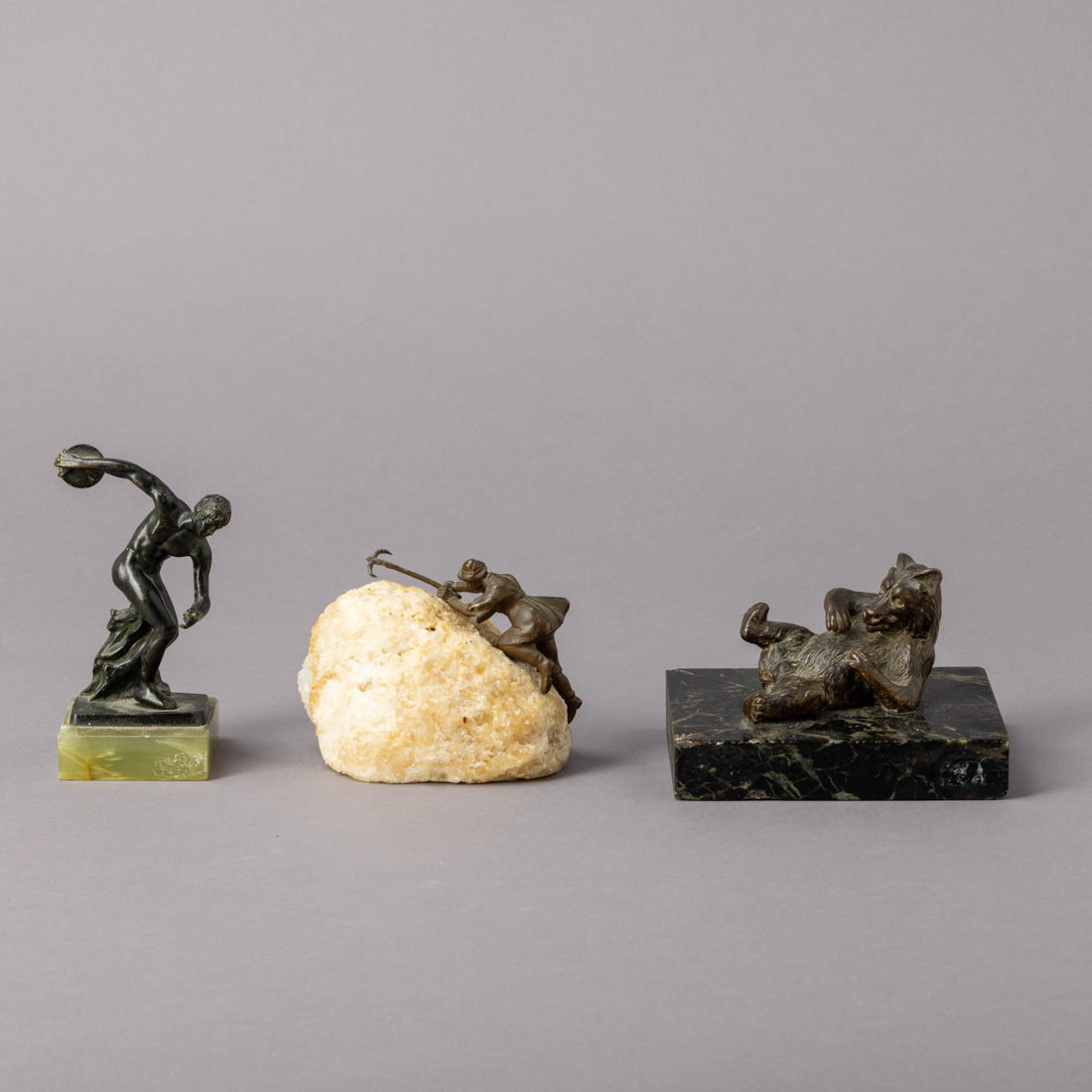Três esculturas em bronze patinado e diferentes pedras. Sinais de uso.