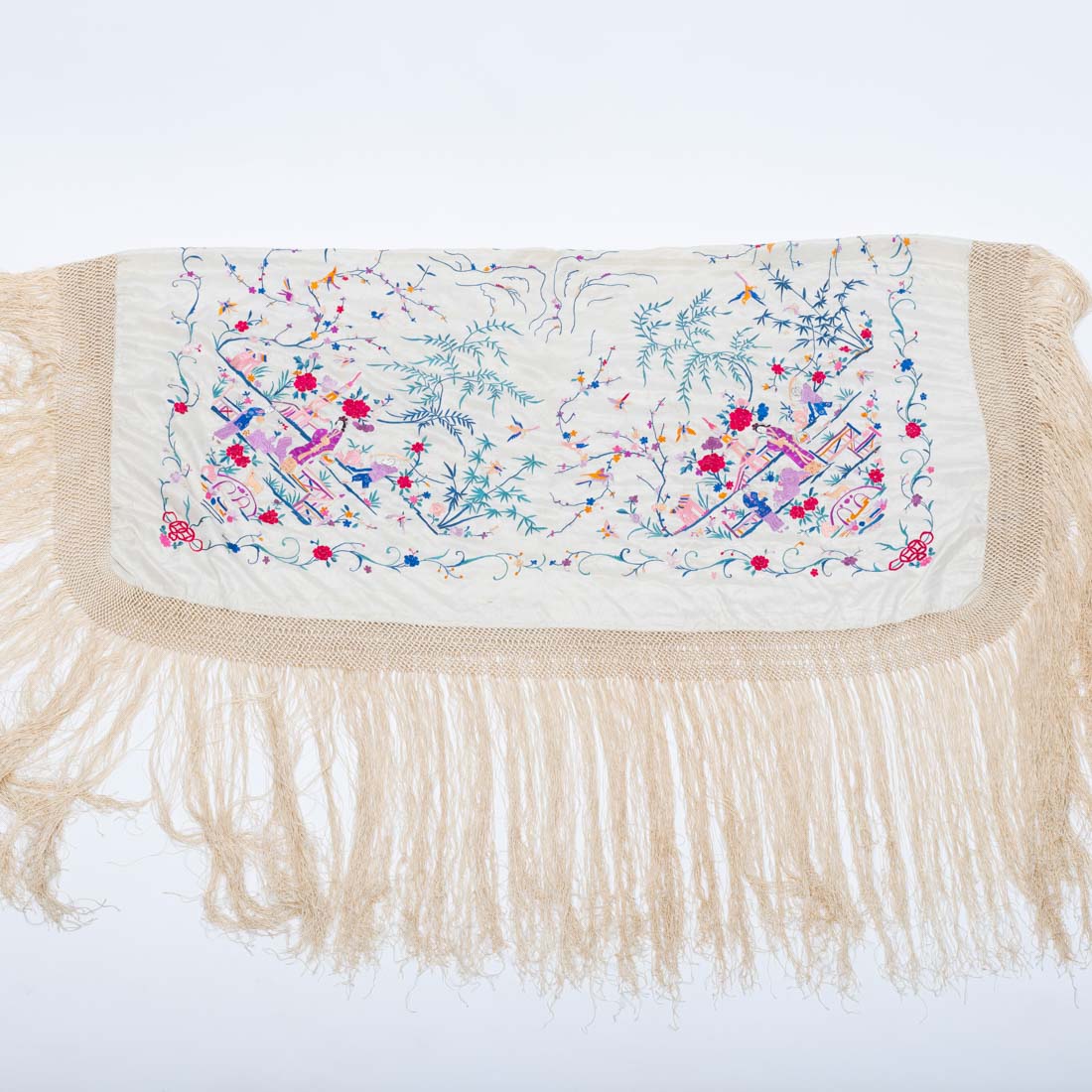 Em seda bordada a matiz de seda com motivos florais, pagodes e figuras orientais. China, Séc. XIX/XX. Pequenos manchas e defeitos.