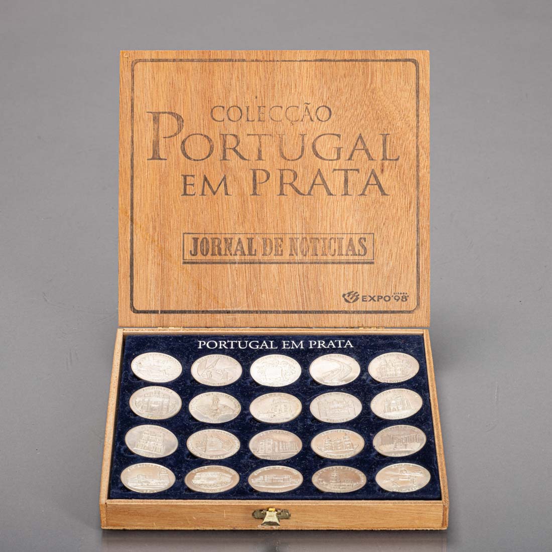 Composto por vinte moedas em prata portuguesa contraste águia (pós 1985) de 925. Edição Jornal de Noticias - Expo 98. Caixa original em madeira. Sinais de uso.