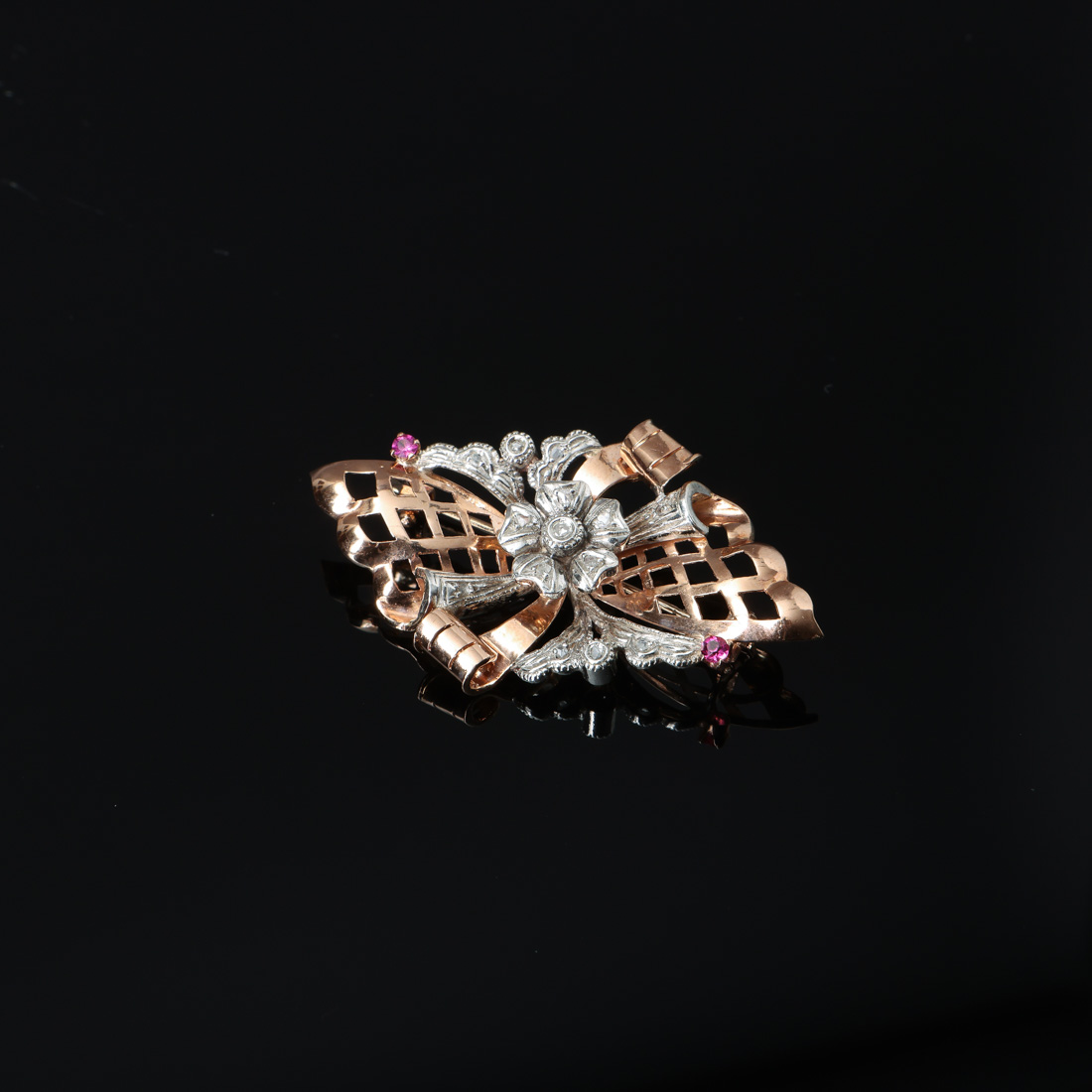 Em ouro de 19.2Kt., e prata contraste cão e galo (1938-1984), cravejado com diamantes talhe rosa e pedras tom rubi. Sinais de uso.