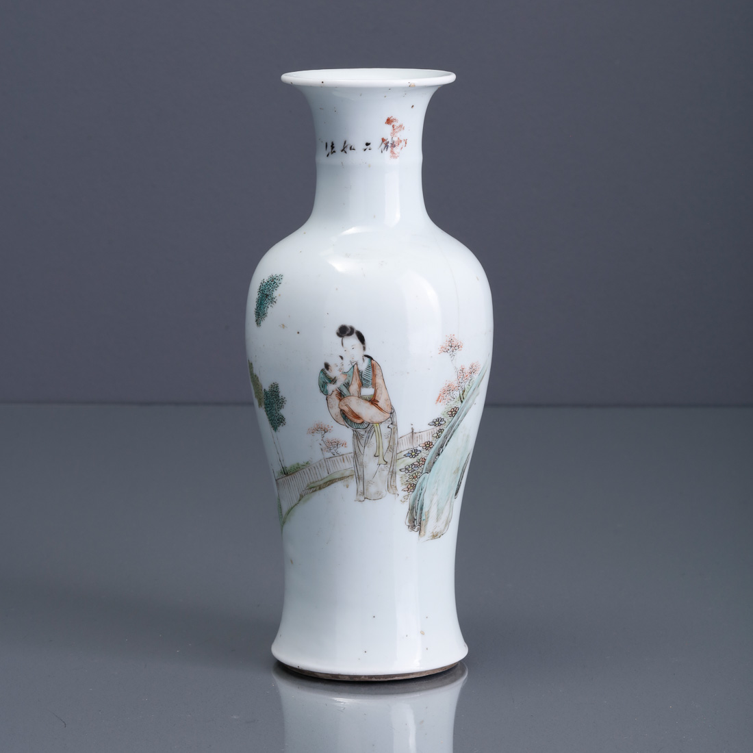 Em porcelana da China, Séc. XIX/XX, decoração policroma com paisagem e figuras, caracteres. Cabelo.