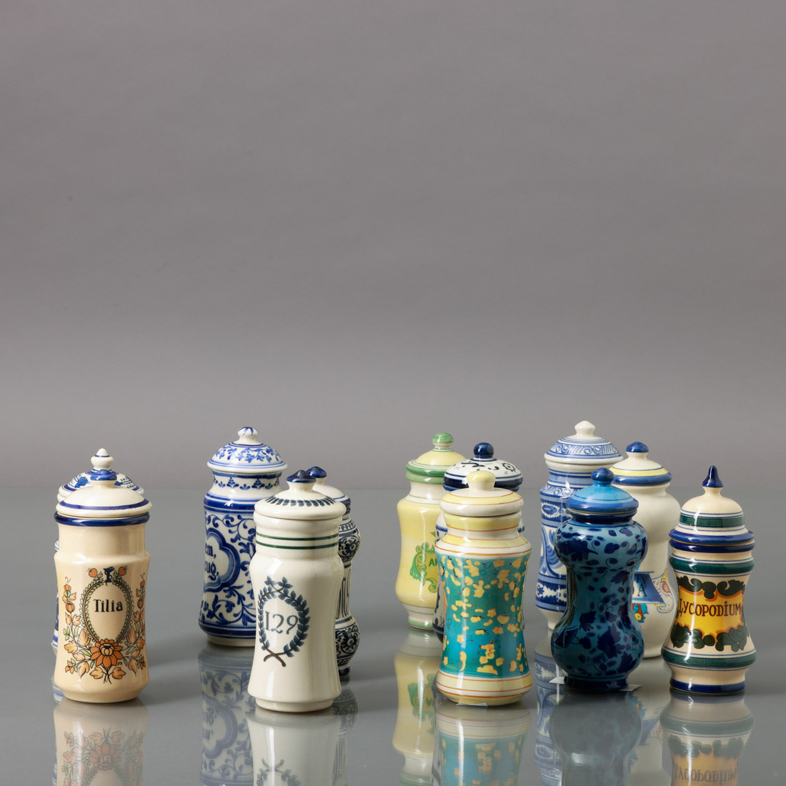 96. DOZE POTES COM TAMPA MINIATURA DE FARMÁCIA