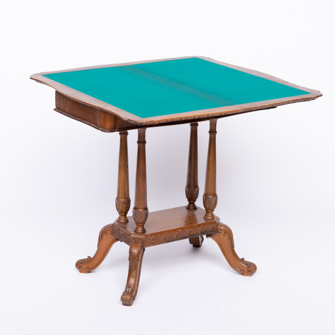 Em nogueira, raiz de nogueira e outras madeiras com entalhamentos vegetalistas, caixa apoiada em quatro colunas, pés curvos, interior forrado a feltro verde. Falhas e pequenos defeitos.