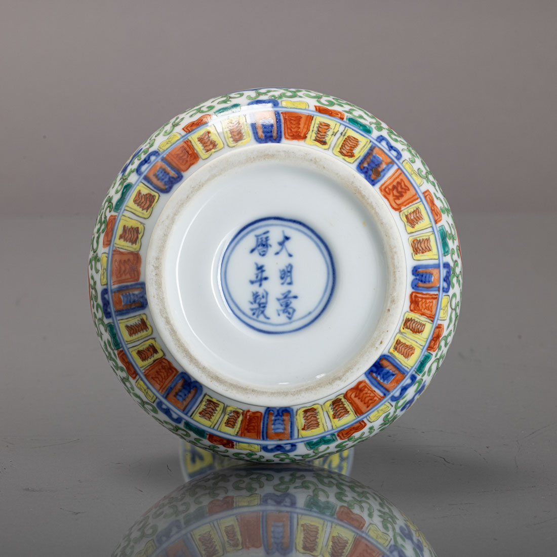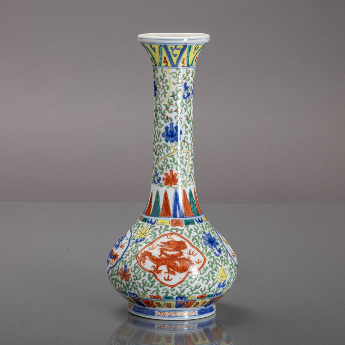 Em porcelana da China, decoração policromada com elementos vegetalista, reservas com dragões. Marcada. Sinais de uso.