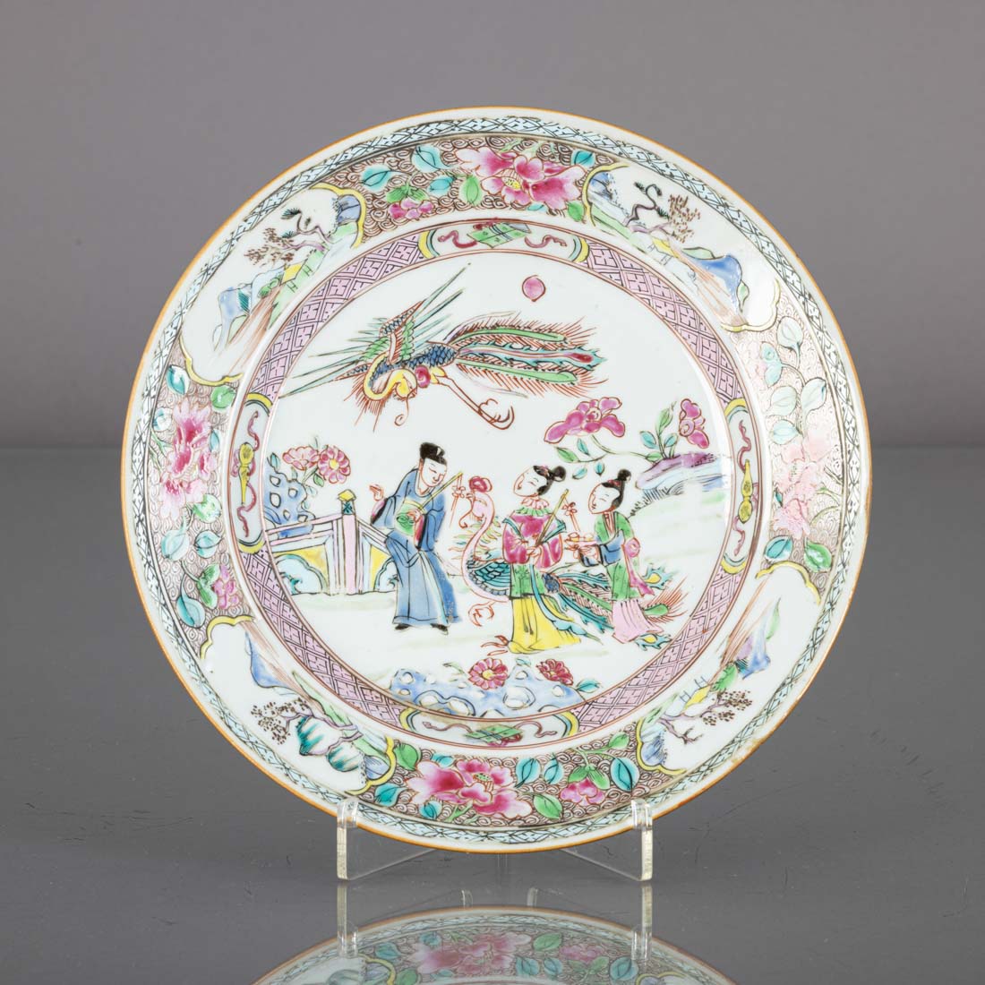 Em porcelana da China, decoração policromada paisagem com figuras e fénix, aba com flores, reservas com paisagens. Sinais de uso.