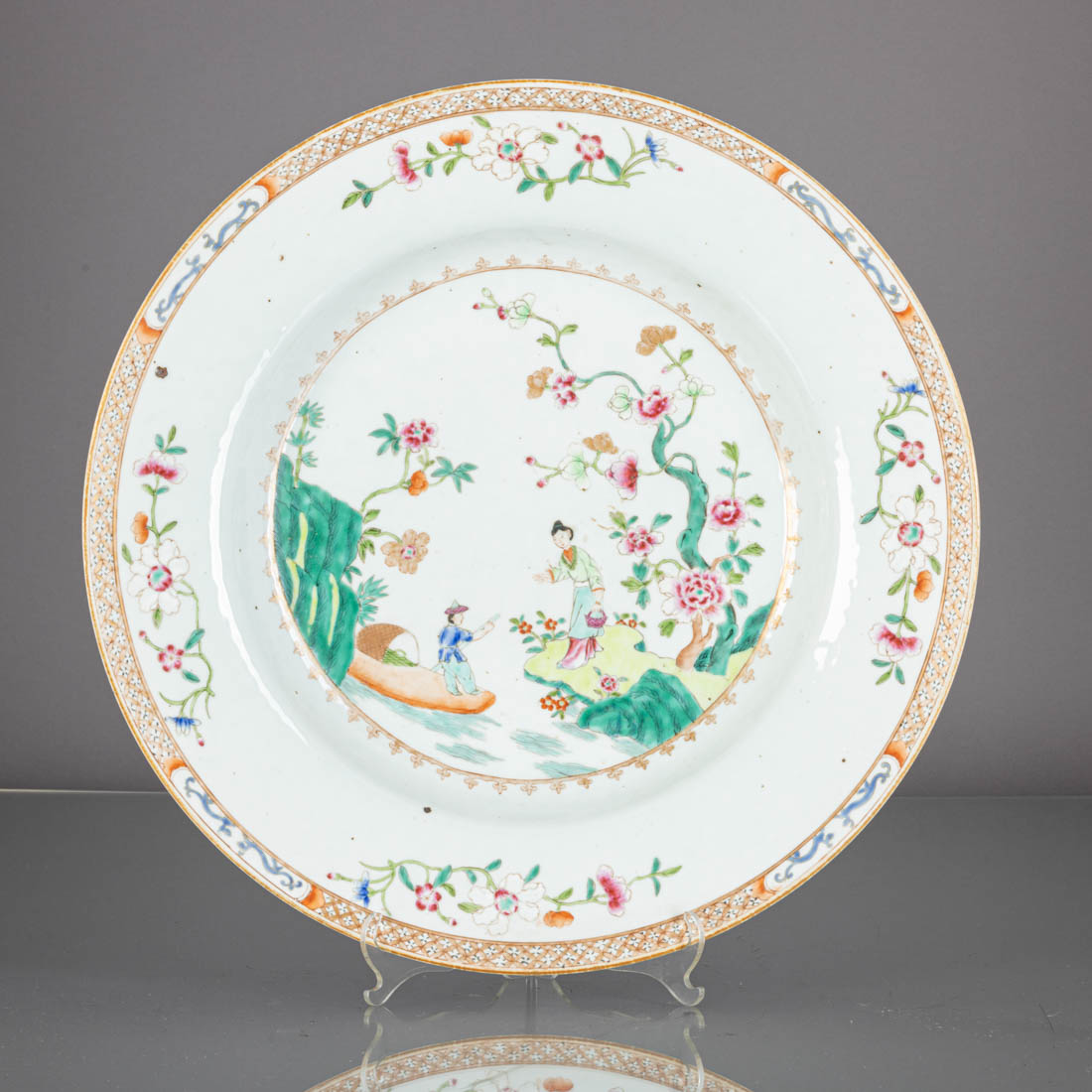 Em porcelana da China Companhia das Índias, decoração com esmaltes policromos da família rosa e dourado "Paisagem com barco e figuras orientais". Sinais de uso.