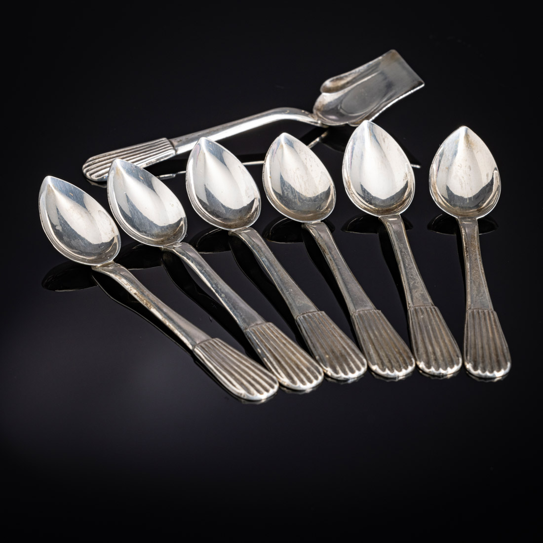 774. CONJUNTO DE SEIS COLHERES DE CAFÉ E CONCHA DE AÇÚCAR