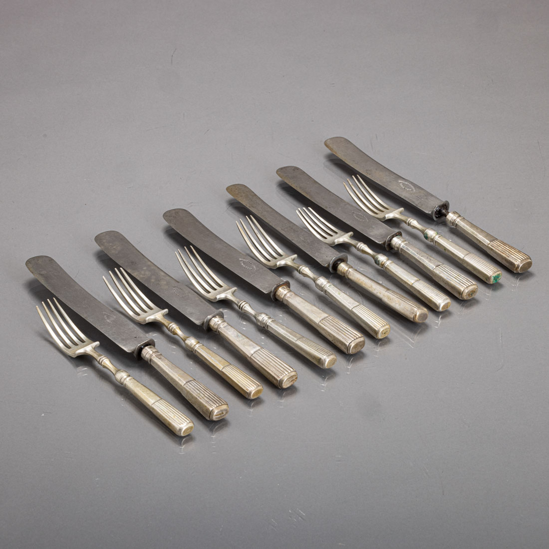 Em prata portuguesa do Séc. XIX, marca de ensaiador do Porto (P-78) Guilherme Guedes Mancilha e de ourives (P-227) Joaquim José Correia, decoração caninhas. Sinais de uso, pequenos defeitos nas facas.