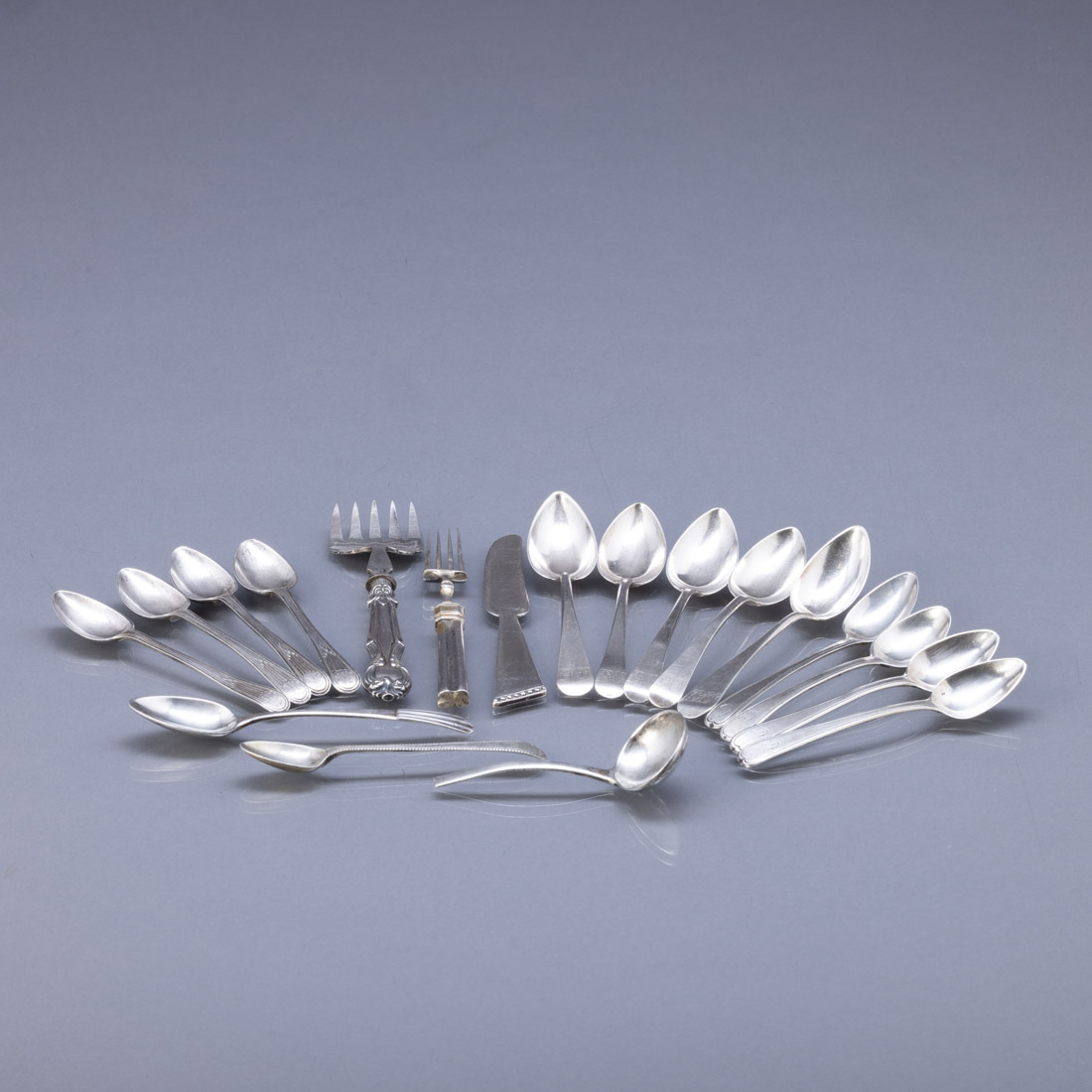 540. 16 COLHERES DIVERSAS, FACA E 2 GARFOS - Em prata portuguesa P.A: 366 g.