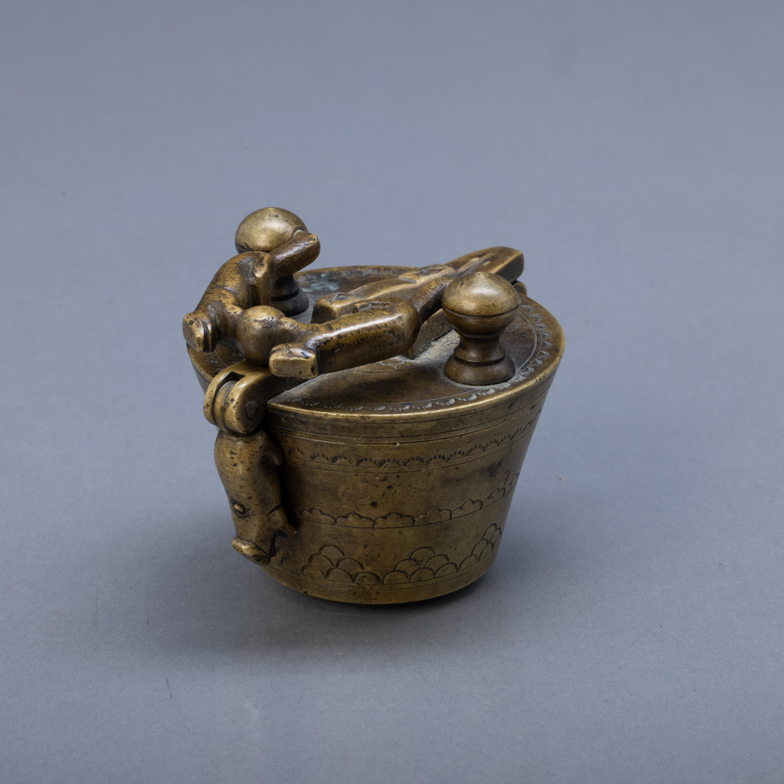 Em bronze, decoração relevada e gravada "animais e desenhos geométricos". Sinais de uso.