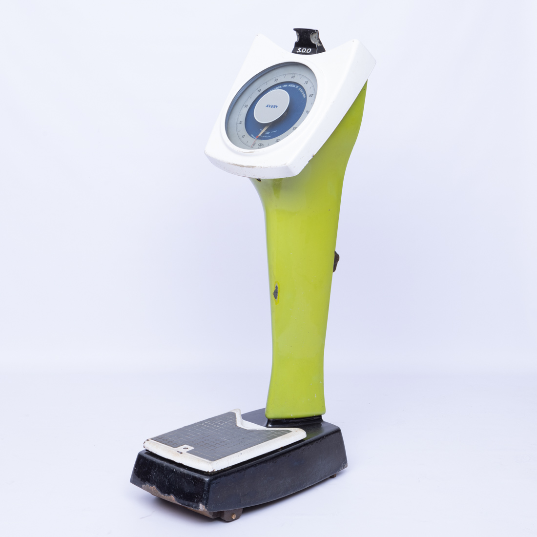 Em ferro esmaltado e outros materiais, tipo 3809 CFY nº. 704501, fabrico inglês por Avery Birmingham. Em funcionamento.