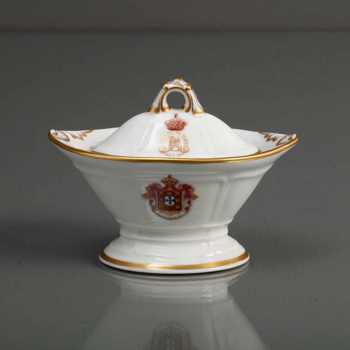 Em porcelana moldada e relevada (1980-1992), decoração policroma e ouro com armas reais de Portugal (D. Luís e D. Maria Pia). Edição limitada para o Clube de Coleccionadores (1764/2500). Peça exclusiva do ano 1991. Sinais de uso.